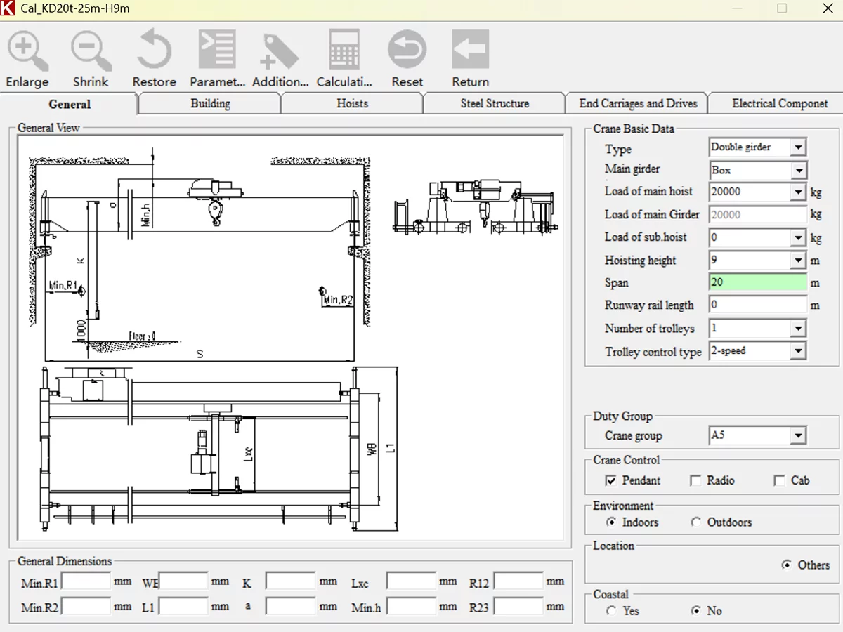 Provides comprehensive outputs including major component specifications, wheel load data, motor parameters, preliminary drawings, offer sheets, main girder data, and detailed drawings.